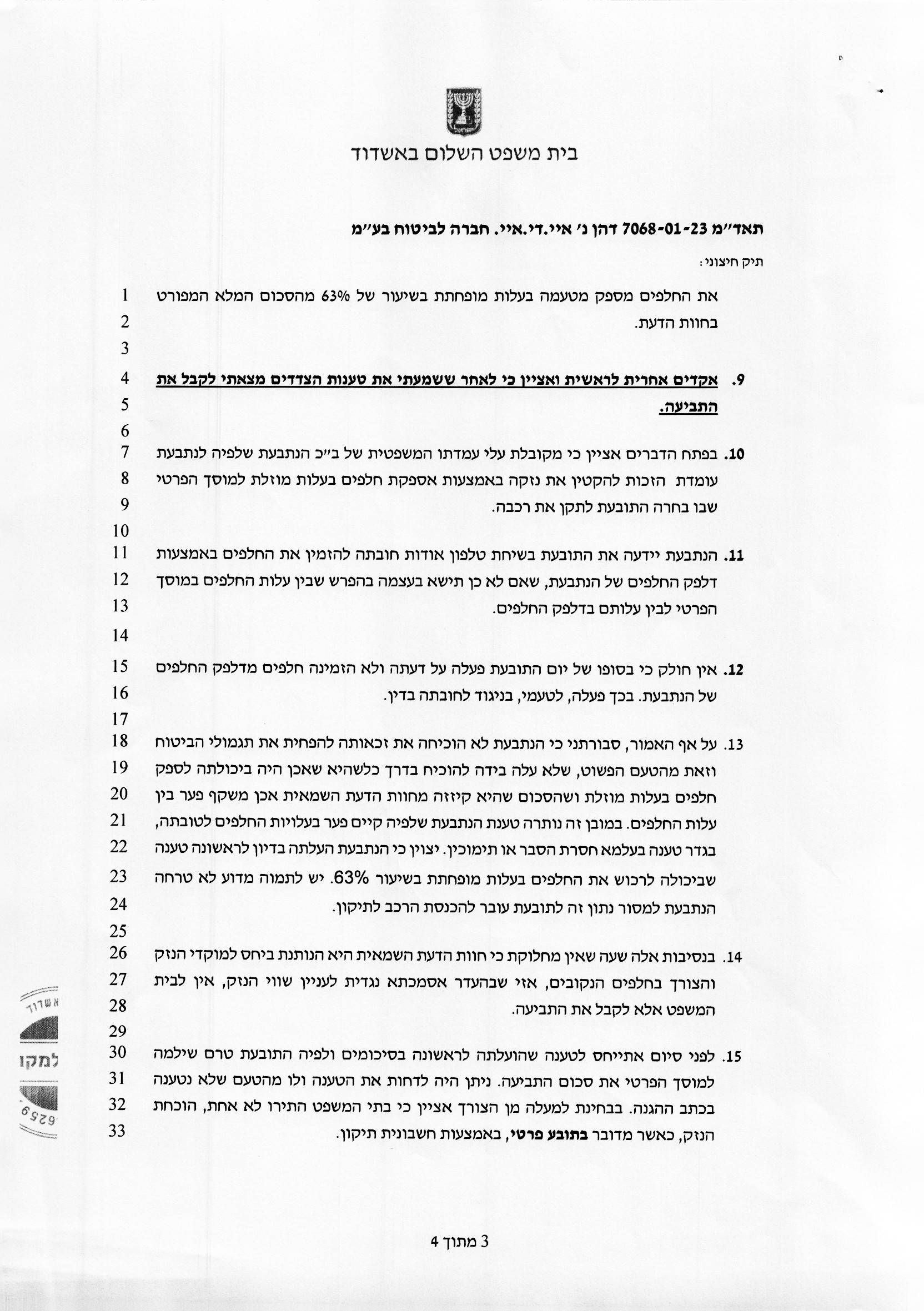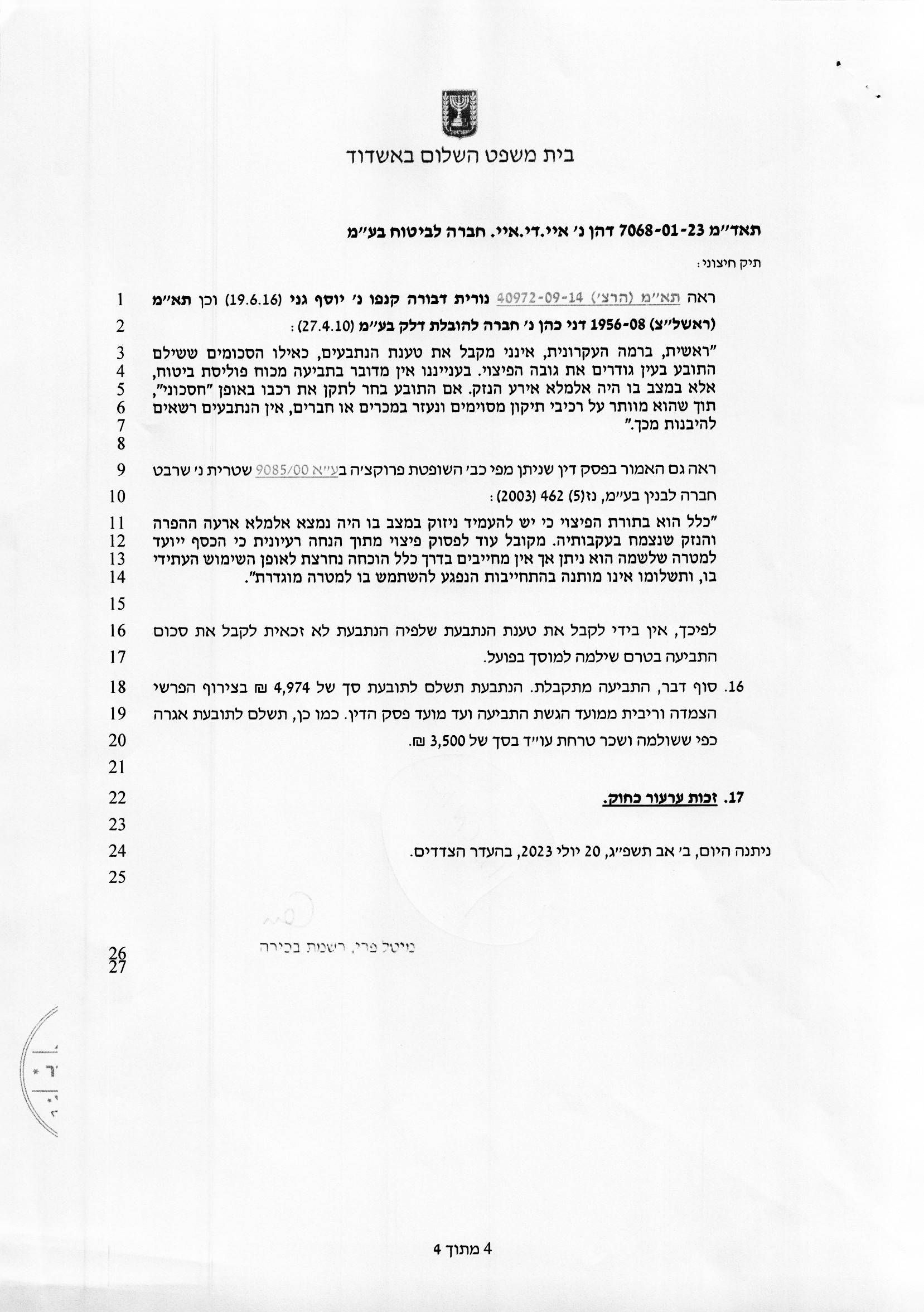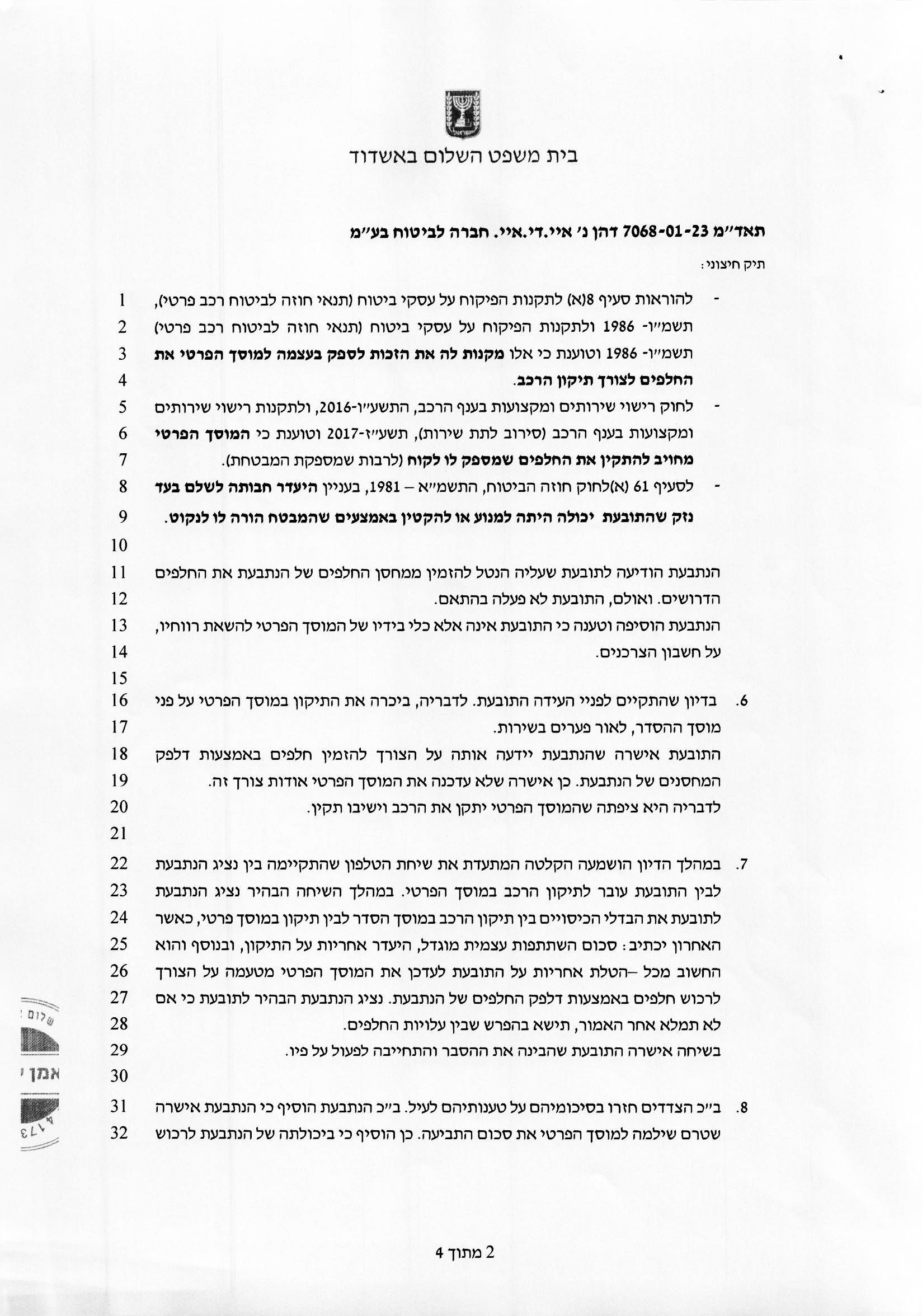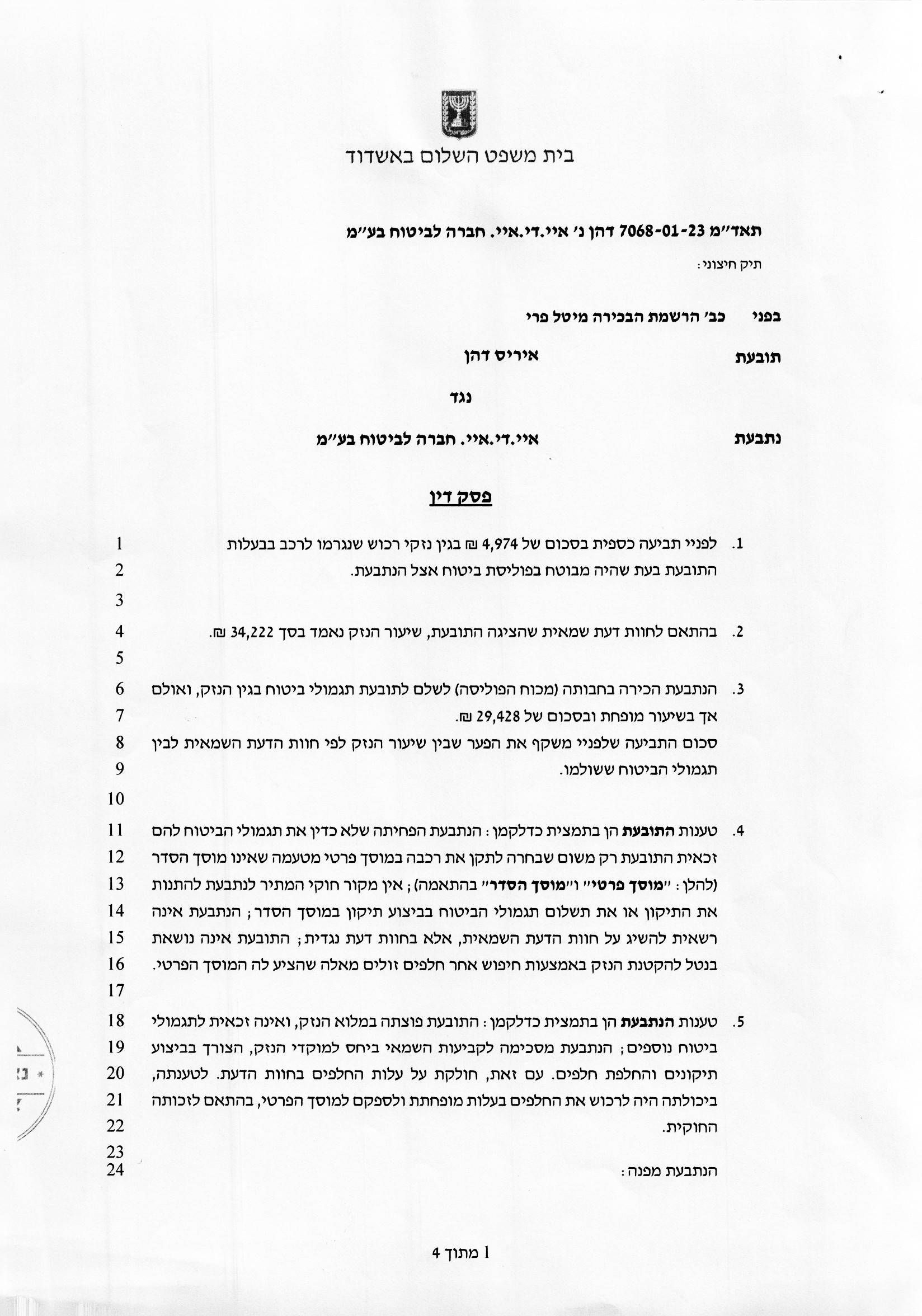 פסק דין בנוגע לתיקון הרכב שלא במוסך הסדר